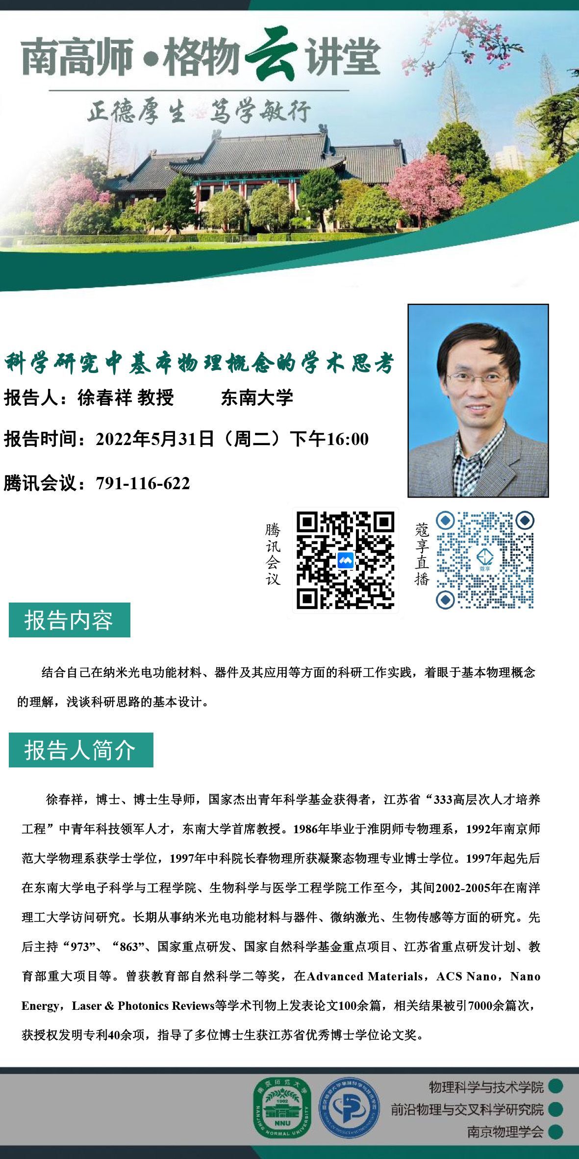 【欧洲杯直播预告 】“南高师·格物云讲堂” 科学研究中基本物理概念的学术思考--徐春祥教授