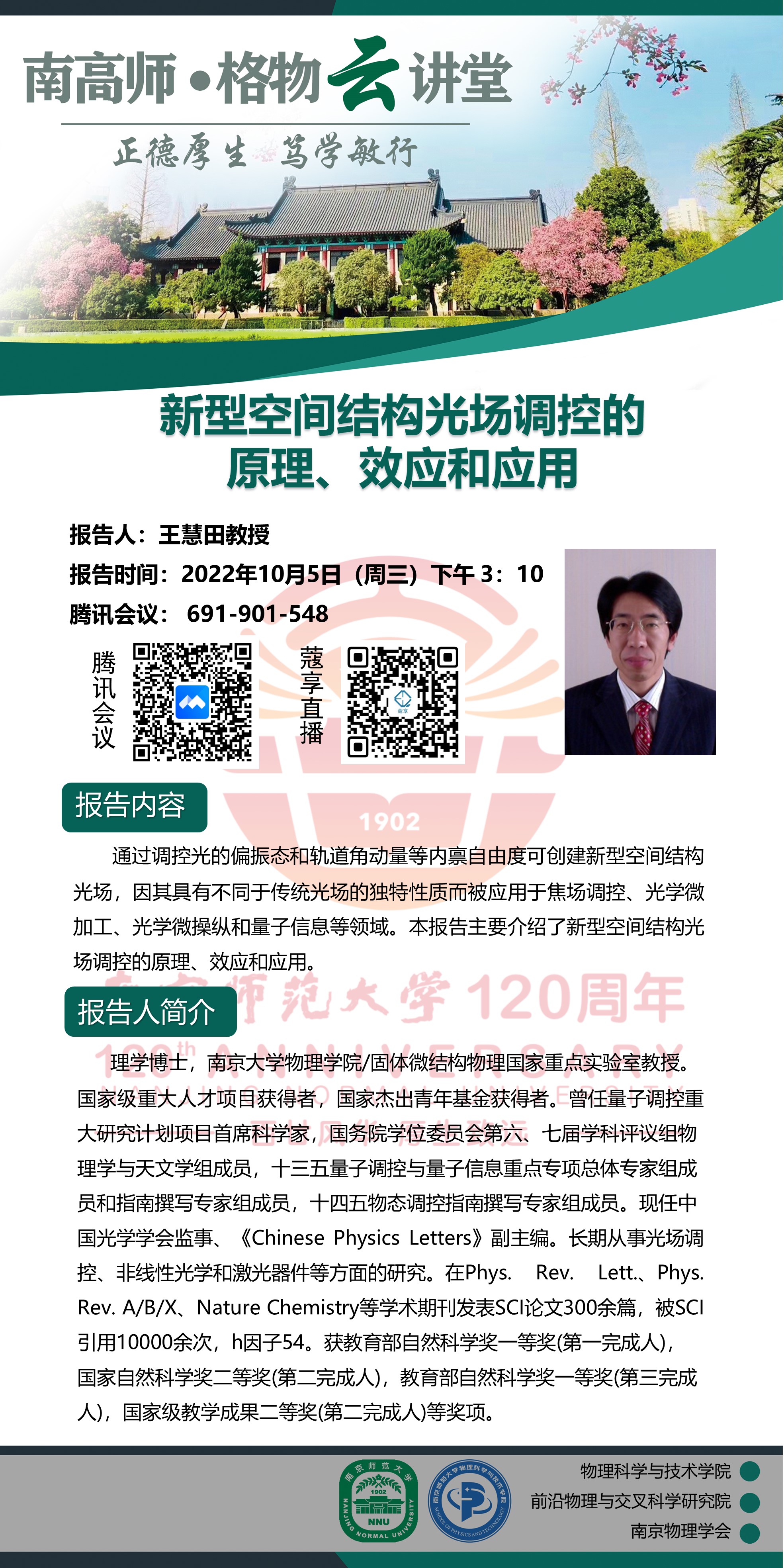 【欧洲杯直播预告 】“南高师·格物云讲堂” 新型空间结构光场调控的原理、效应和应用--王慧田教授