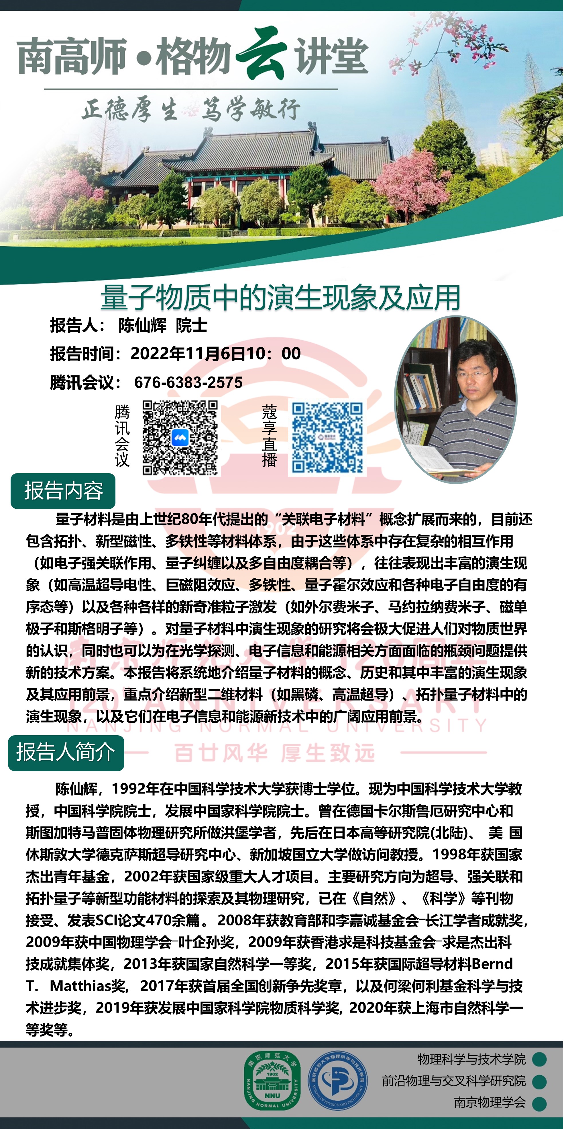 【欧洲杯直播预告 】“南高师·格物云讲堂” 量子物质中的演生现象及应用--陈仙辉院士