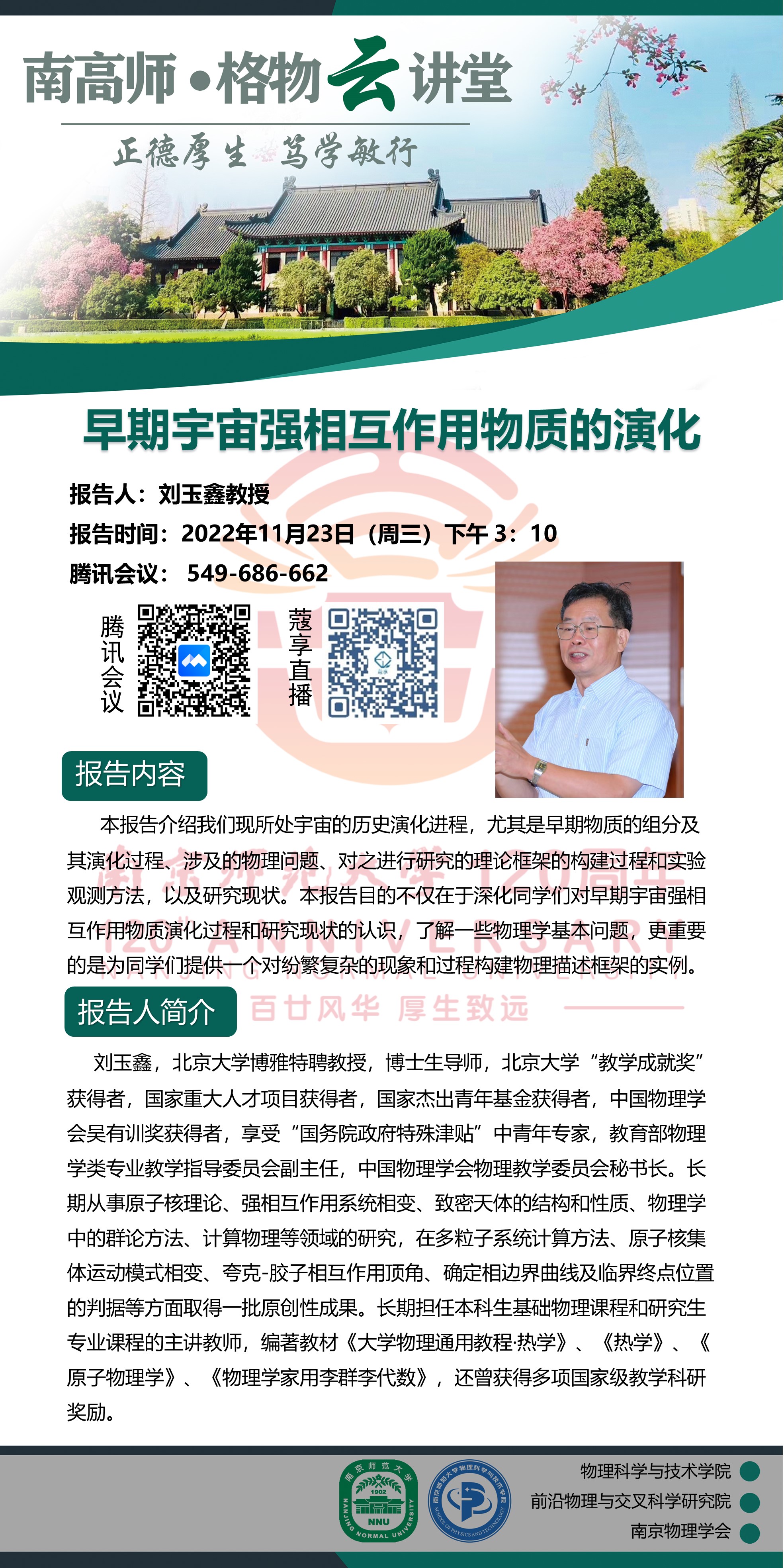 【欧洲杯直播预告 】“南高师·格物云讲堂” 早期宇宙强相互作用物质的演化--刘玉鑫教授