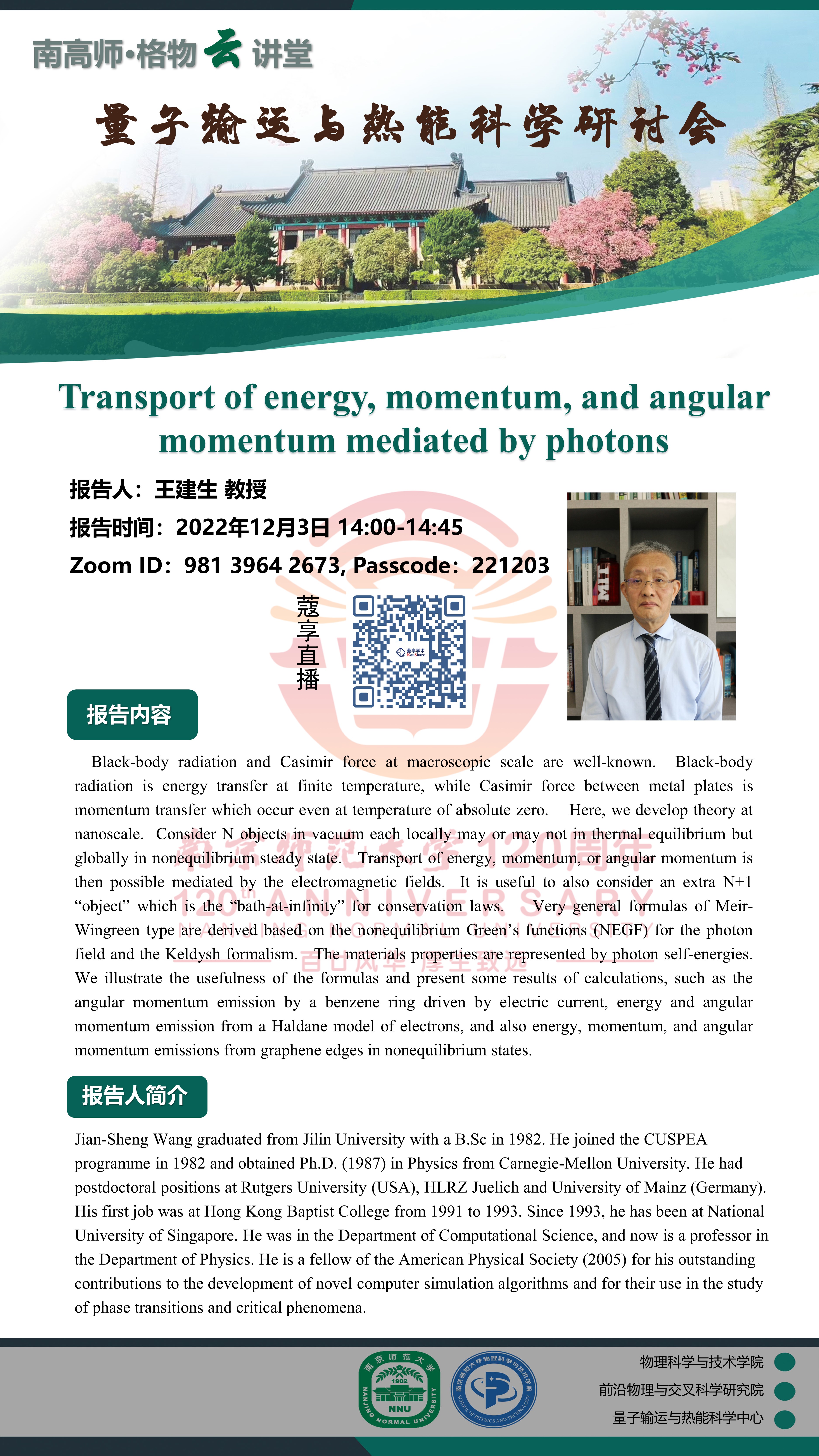 【欧洲杯直播预告 】“南高师·格物云讲堂” Transport of energy, momentum, and angular momentum mediated by photons—王建生教授