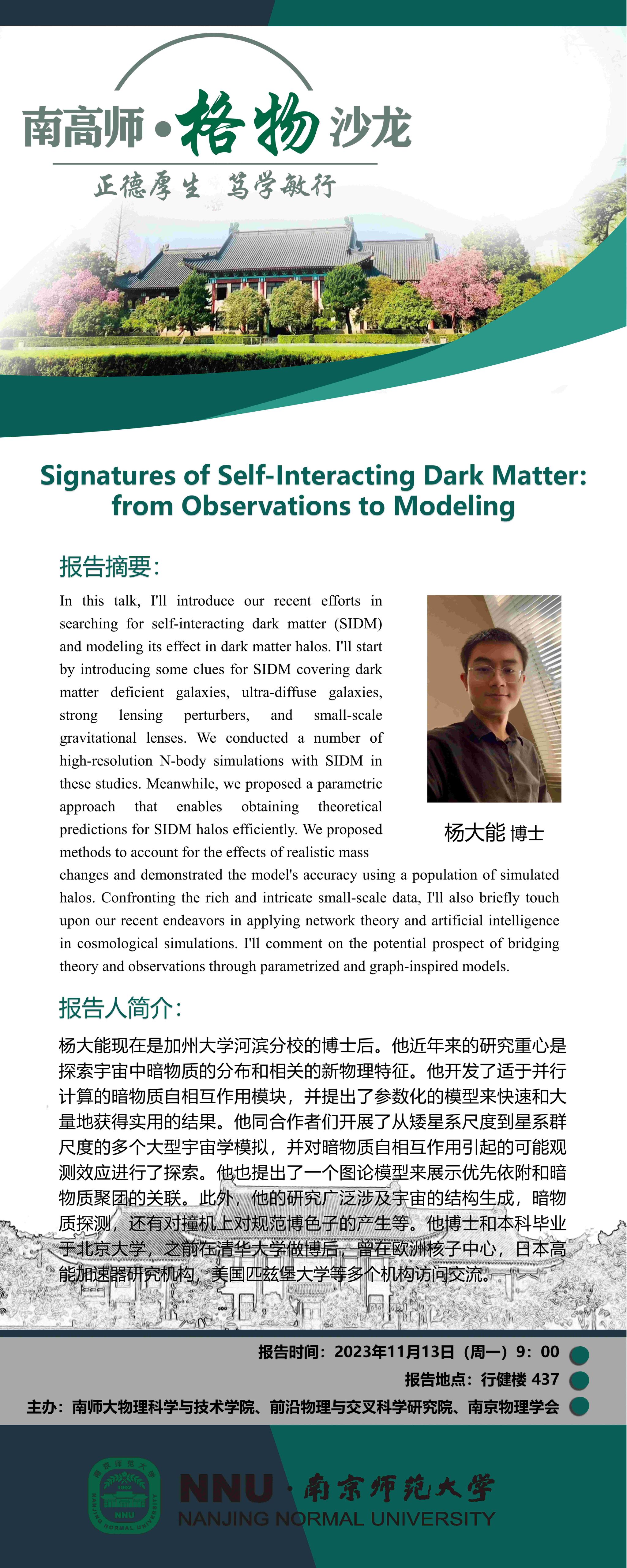 【欧洲杯直播预告 】“南高师·格物沙龙” Signatures of Self-Interacting Dark Matter:from Observations to Modeling--杨大能博士