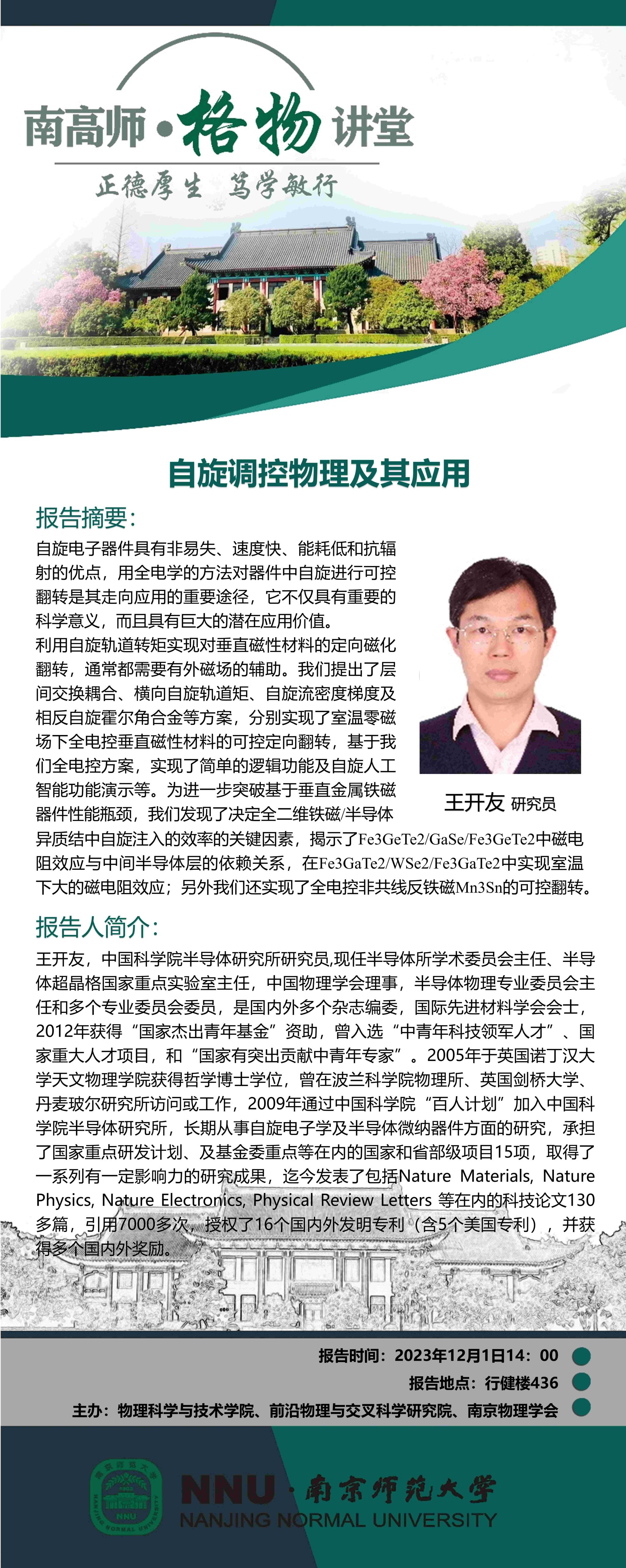 【欧洲杯直播预告 】“南高师·格物讲堂”自旋调控物理及其应用--王开友研究员