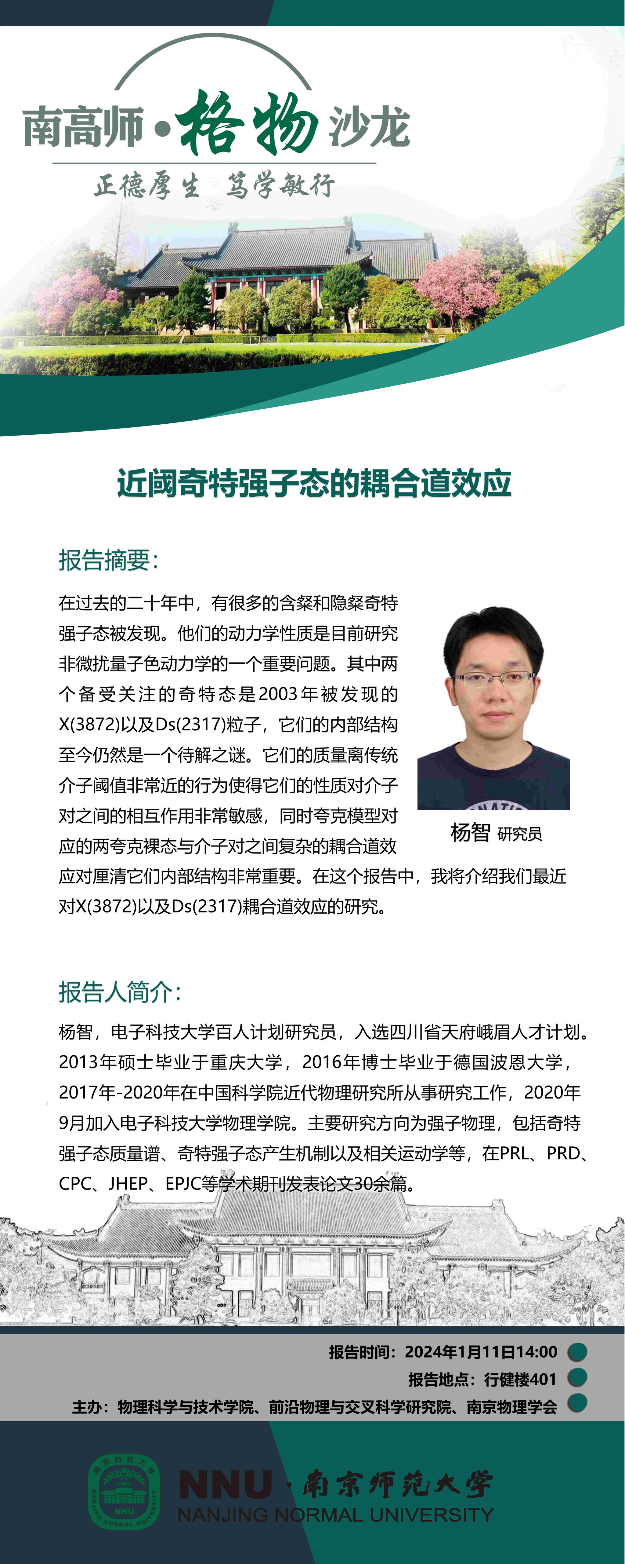 【欧洲杯直播预告 】“南高师·格物沙龙” 近阈奇特强子态的耦合道效应--杨智研究员