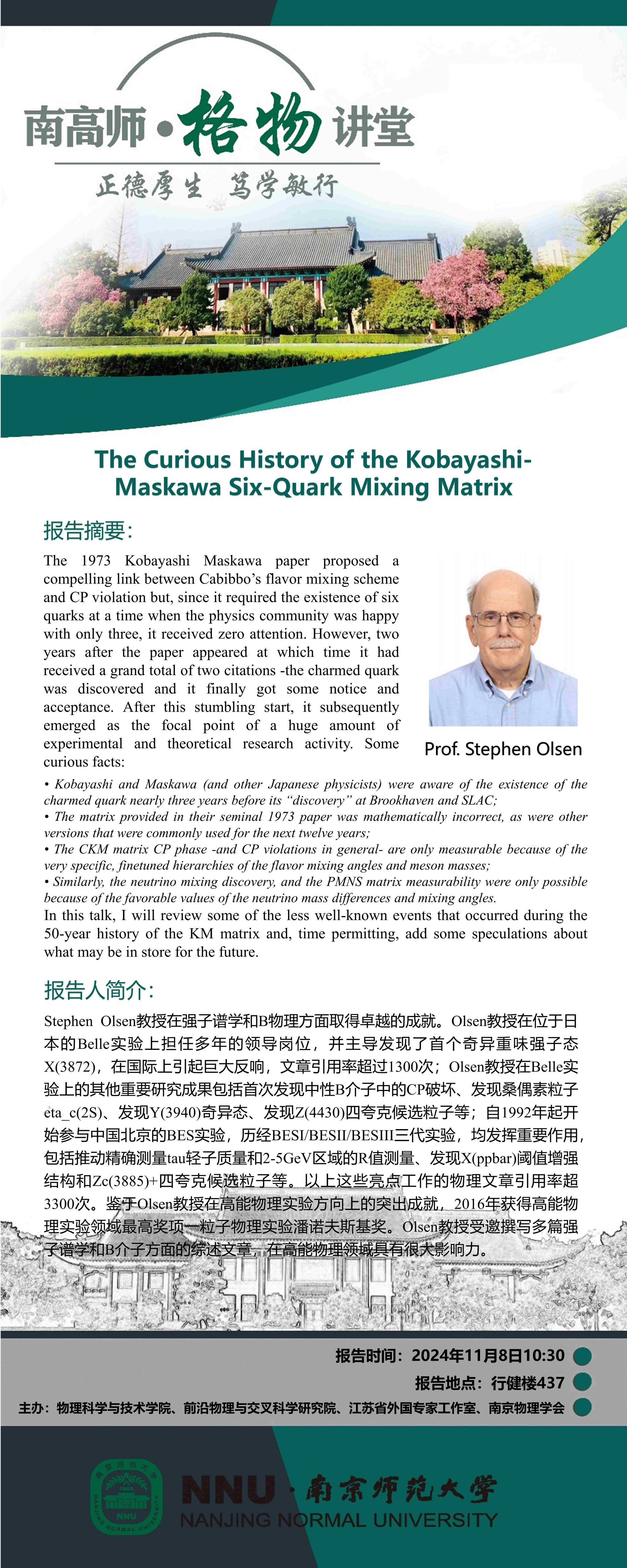 【欧洲杯直播预告 】“南高师·格物讲堂” The Curious History of the Kobayashi- Maskawa Six-Quark Mixing Matrix--Prof. Stephen Olsen