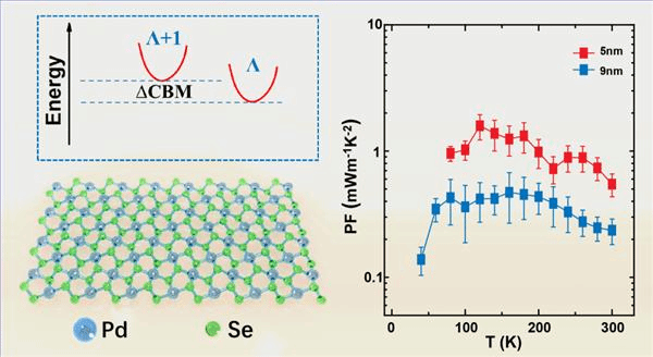 热电材料通过将环境中废热直接转为有效可利用的电能,为当前能源危机提供了一种可持续、绿色便捷的能源补给途径,如何提高热电材料热电特性成为学者不断讨论和研究的话题。二维半导体材料作为后硅半导体时代重要部分,其具有较高载流子迁移率和较大的有效电子质量,其在热电领域中应用近年来也引起了广泛关注。在该工作中,研究人员报道了“能带工程”可以显著提高新型二维半导体材料PdSe2的热电特性,其功率因子可高达 1.5 mWm-1K-2。通过退火处理可以降低接触电阻,同时能够有效去除杂质缺陷和有机物残余。研究人员把热电器件在480K环境中退火4个小时,发现PdSe2导电性提高了将近10倍,同时电子载流子迁移率达到210 cm2V-1S-1,最终热电因子提高了将近3倍。通过对比不同厚度的PdSe2样品热电特性,研究人员发现,越薄的PdSe2 呈现出更好的导电和热电特性。第一性模拟计算证实,随着厚度降低,导带中有额外的能带出现,两个能级发生了简并,从而提供更多电子态密度和创造更多电子通道。考虑PdSe2晶格低对称性导致的较低热导率,研究人员预测室温下其ZT可达0.1,优越于目前报道的其他二维半导体材料。此研究证实,热退火处理和“维度工程”能显著提高材料的新型二维半导体PdSe2热电特性,从而为当前不断涌现的二维半导体材料在低维热电领域提供了新思路。该工作对于探索低维材料应用于物联网自供电领域具有深远意义。