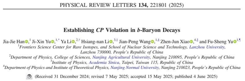 [1] Jia-Jie.Han, Ji-Xin Yu. Ya Li, Hsiang-nan Li, Jian-Peng Wang, Zhen-Jun Xiao and Fu-Sheng Yu, Establishing CP violation in b-baryon decays,Phys. Rev. Lett. 134 (2025) 221801,arXiv: 2409.02821 [hep-ph].